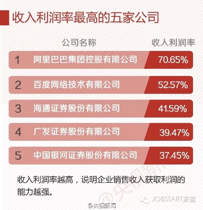 杰博藍(lán)精靈提請關(guān)注:值得注意的是,阿里巴巴集團(tuán)控股有限公司以1.01千億排名148位,雖然未進(jìn)入前百強(qiáng),但按利潤率計(jì),阿里巴巴以70.65%排名第一,百度以52.57%排名第二,海通證券、廣發(fā)證券、中國銀河證券分別以41.59%、39.47%、37.45%獲三至五位。