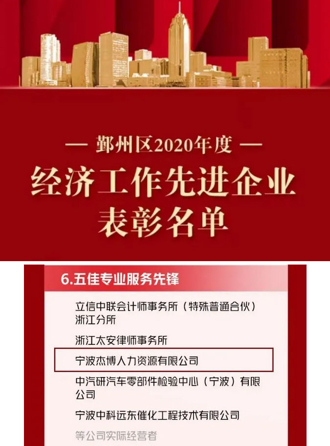恭喜杰博榮獲寧波市鄞州區(qū)2020年度“五佳專業(yè)服務(wù)先鋒”稱號(hào)